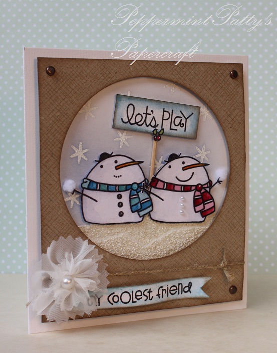 Here's my entry for this month's SPARKS challenge at Paper Smooches. I've used stamps from Swanky Snowdudes and Chubby Chums. The picture looked very wintery to me and I picked up the handmade flower, the colors, pearls, glitter and woodtexture in my card.