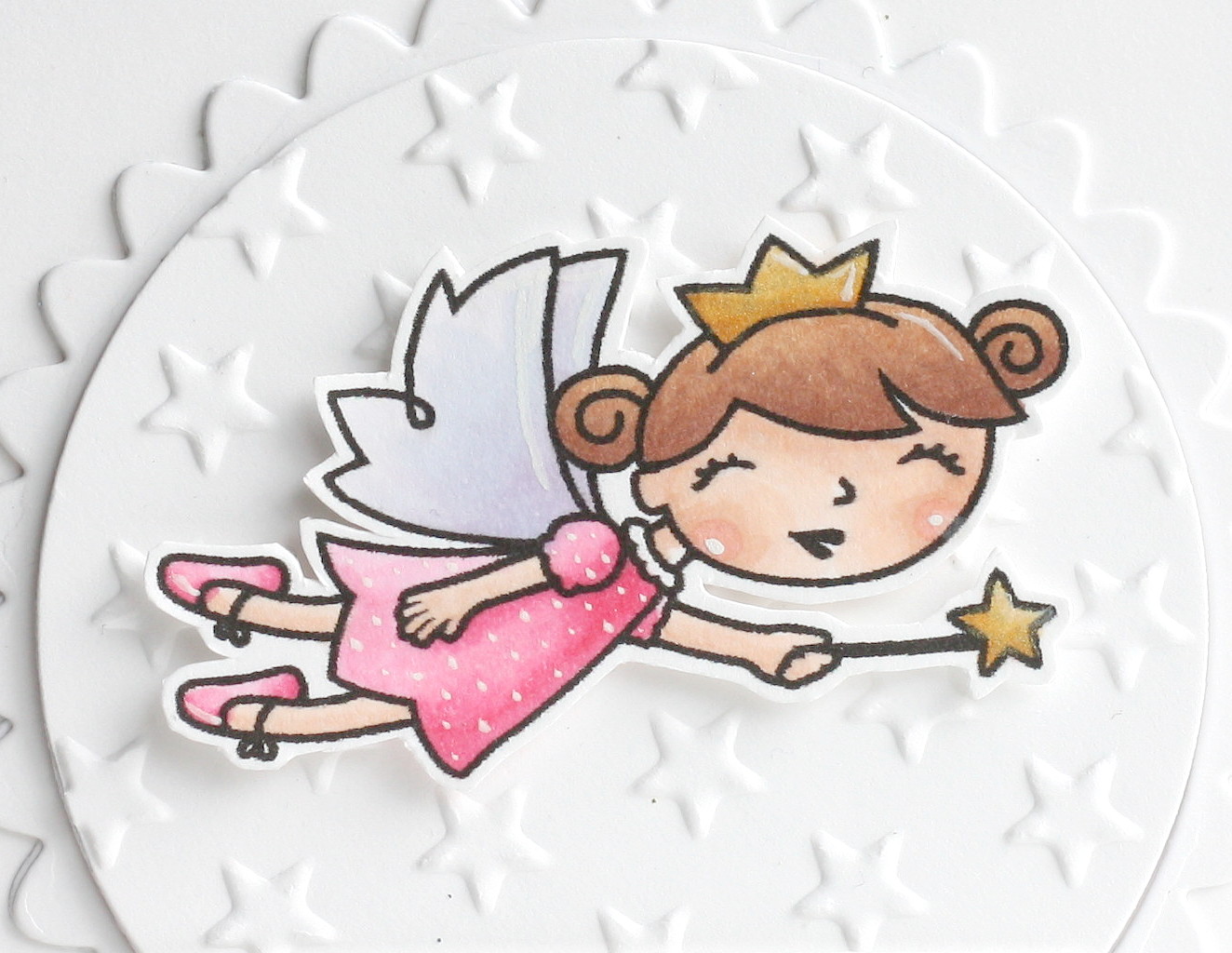 I love your card design! The white space looks great with the scalloped frame and embossed stars in the background. It really makes that darling fairy pop!